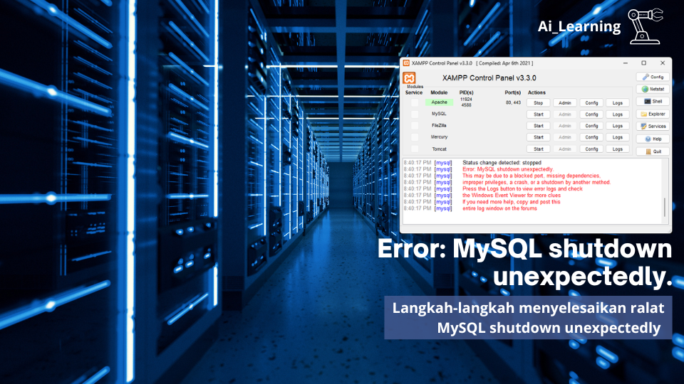 Error "MySQL shutdown unexpectedly" bermaksud MySQL tidak dapat dimulakan seperti biasa dan telah ditamatkan secara tiba-tiba. Ini sering berlaku pada XAMPP atau aplikasi lokal yang menjalankan MySQL dan boleh disebabkan oleh beberapa sebab berikut: